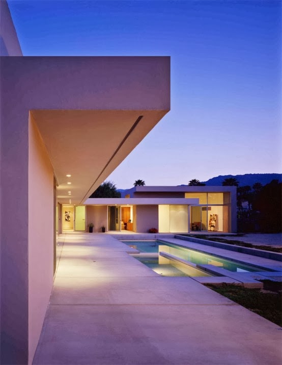 This 2,600 square feet residence is designed by OJMR Architects for retired couple and located in Palm Springs, California. The house is located on a flat, irregularly shaped lot at the end of a cul-de-sac and wrapped around the pool. It consist of two blocks with very simple rectangular shape which helps to simplify the overall look of the site. The blocks are connected together to define a corner with guest bedrooms in one wing and master suite in the other. Public areas like the kitchen, living room and dining room are located between wings. The rooms all access the courtyard with the pool through sliding glass walls. The house is the golden middle between enclosure and openness to outdoors.![]() |